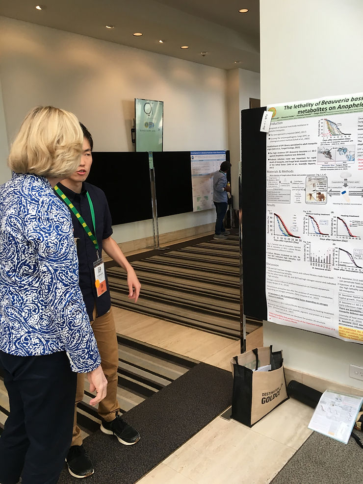 畑中くんの演題は「病原力の異なるBeauveria bassiana 2系統を用いたハマダラカ体内での感染動態の比較」で、病原力の異なる昆虫寄生菌のハマダラカ体内での感染動態を観察し、宿主免疫反応の打破の如何によって病原力に差が生じることを明らかにしました。今後はこの差を詳細に解析することにより、宿主の免疫を掻い潜る昆虫寄生菌の新たな殺虫メカニズムの解明が期待されます。また、石倉さんの演題は「タバココナジラミ卵の成熟度合が昆虫寄生菌Lecanicillium spp.の感染に与える影響」で、これまで昆虫寄生菌のLecanicillium属菌がコナジラミ卵に感染して殺卵することを明らかにしてきましたが、オンシツコナジラミ とタバココナジラミ間で感染性が異なる現象が見られました。そこで、タバココナジラミ卵の成熟度合と菌の感染性を比較したところ、未成熟卵は成熟卵に比べて菌の感染を受けやすいことを明らかにしました。これらの研究によって、特にコナジラミ卵を標的に昆虫寄生菌を施用する際は、予防的防除技術が有効である可能性が示されました。