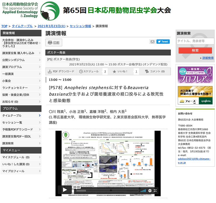 今週から第64回応用動物昆虫学会が、オンラインで開催されました。当ラボからは、3題の発表を行いました。演題は以下のとおりです。